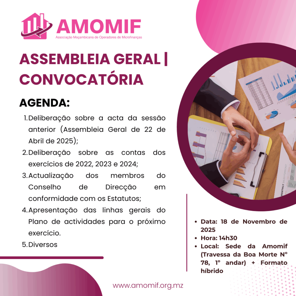 Nos termos legais e estatutários, convoca-se a Assembleia Geral da AMOMIF – Associação Moçambicana de Operadores de Microfinanças, com sede nesta cidade de Maputo, para reunir na terça-feira, dia 18 de Novembro de 2025, pelas 14.30 horas, em formato híbrido.